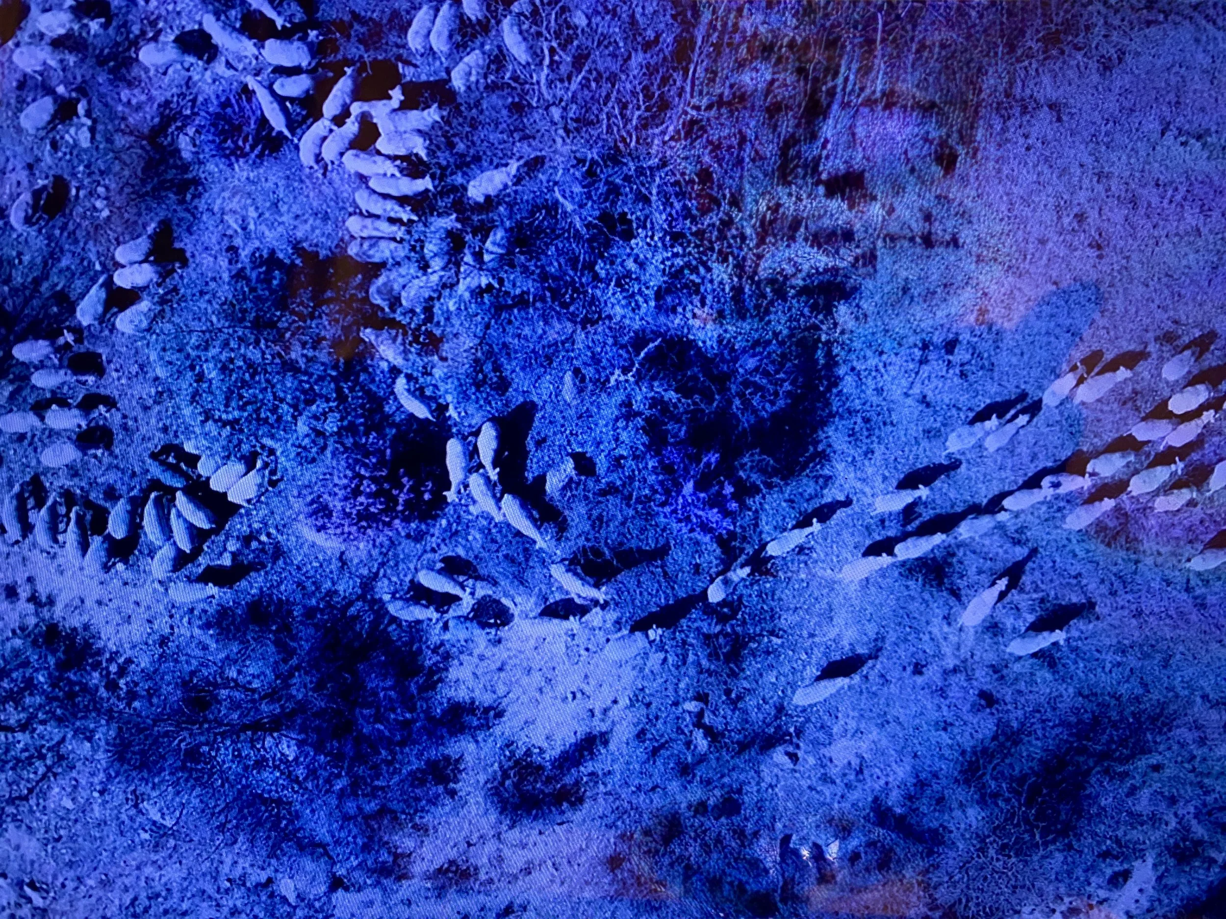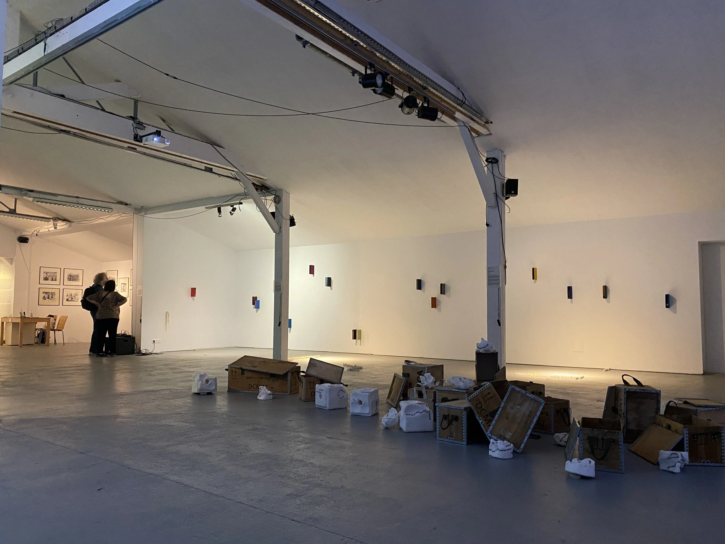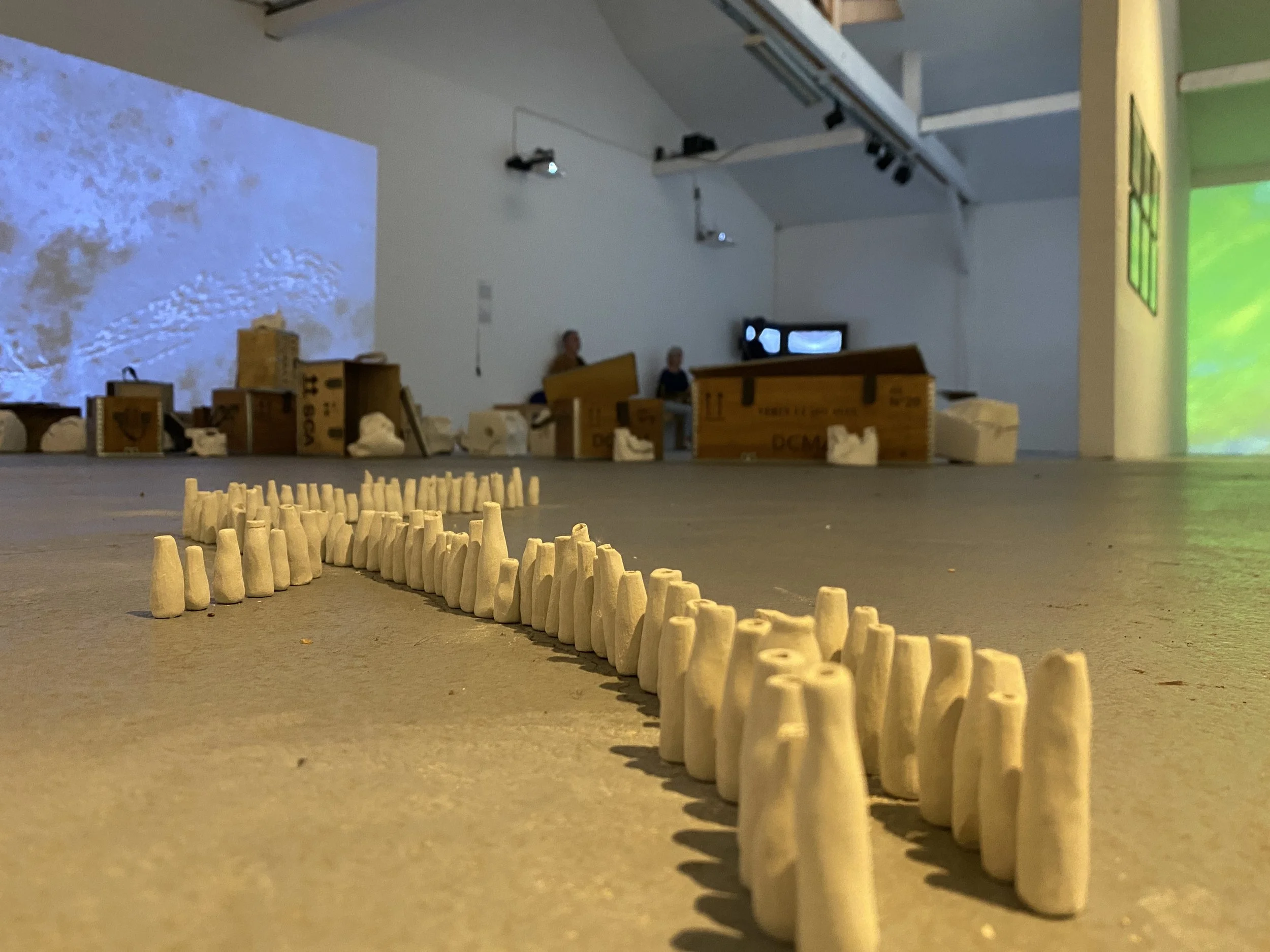 Presented at Apollonia, European art centre, Strasbourg (2025), Érosion brings together sculptures, video and objects around the processes of transformation and circulation of materials. Salt stones, shaped by the action of living organisms, resonate with the video Flux, while transport boxes question the logic of packaging and exchange of goods on a territorial scale.