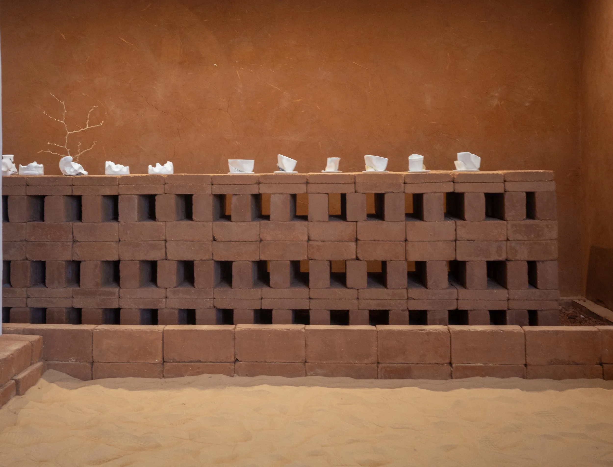 The pieces presented are part of a research project on salt, a material historically linked to trade and the movement of people and goods. The porcelain sculptures are made from shapes eroded by the repeated action of animals' tongues on salt licks used in livestock farming. Through a process of isomorphism, these natural shapes are transposed into porcelain, a material historically associated with luxury and the global circulation of goods. The installation thus articulates the transformation of matter, the memory of uses and a reflection on the boundary between sculpture, object and design. In dialogue with earthen architecture, the works question the relationships between art, craftsmanship and mass production, offering forms that are both sculptural and potentially utilitarian.
